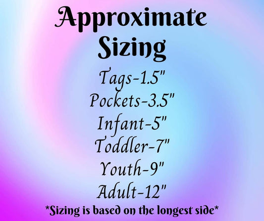 All of our CUSTOM SINGLE DTF TRANSFERS are offered in the following sizes: